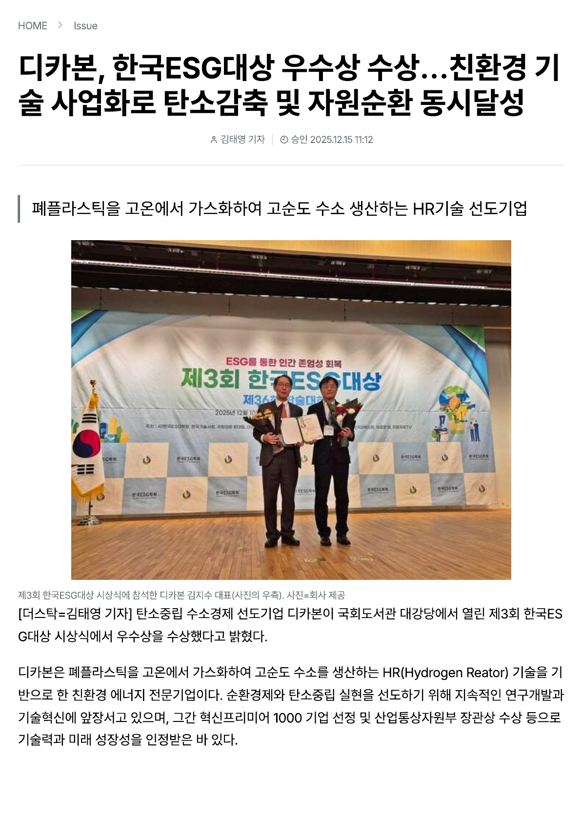 [회사 동정] 디카본, 제3회 한국ESG대상 ‘우수상’ 수상